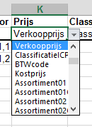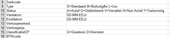 In dit tabblad staan de veldnamen die gekozen kunnen worden in het uitklapvenster. In dit tabblad staat ook informatie over codes van velden. Bijvoorbeeld bij type artikel. Het programma verwacht een code S, B of L.
