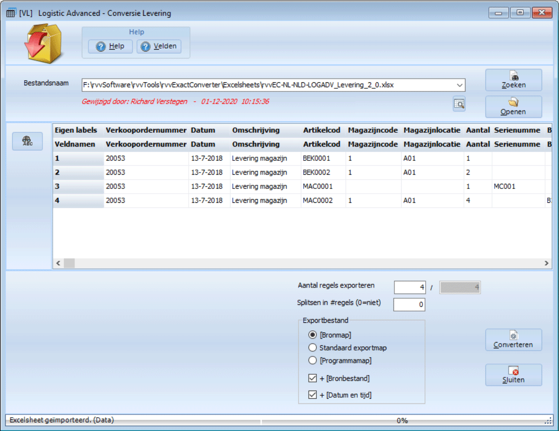 Bij het testen kan het handig zijn om eerst 1 regel te converteren en als alles naar wens is ingevuld, dan dat alle regels wordt geconverteerd.